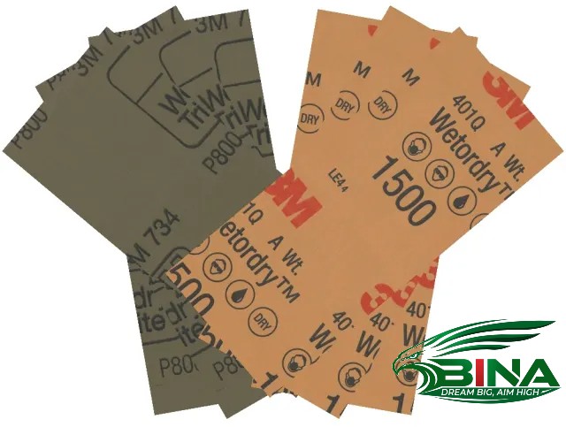 1. Giấy nhám ướt 3M (407Q): Chống thấm nước và bền, thích hợp cho thân xe ô tô, sơn và hoàn thiện kim loại; cần chà nhám ướt.