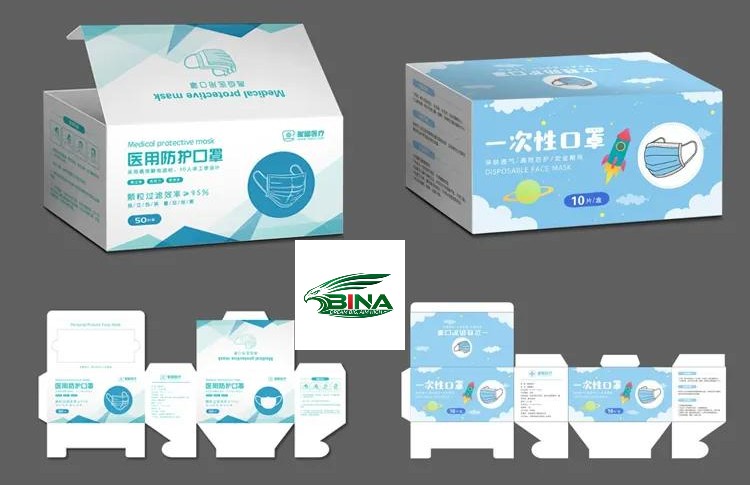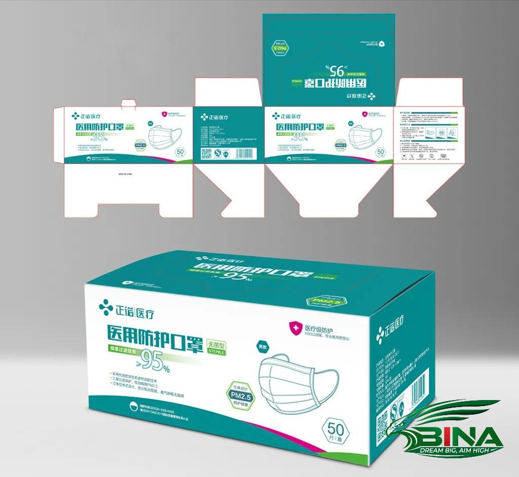 - Thiết kế và bố cục: Hình dạng hộp được thiết kế dựa trên số lượng khẩu trang (ví dụ: 50) và chất liệu. Giấy tráng phủ một mặt (bìa cứng trắng) thường được sử dụng để tăng độ bền và nhãn hiệu, thành phần, thông tin nhà sản xuất được xác nhận để tuân thủ các quy định.