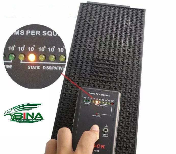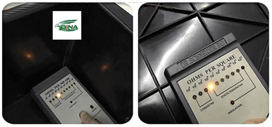 - Khả năng khử tĩnh điện: Nhanh chóng dẫn tĩnh điện xuống đất. Điện trở bề mặt thường được kiểm soát trong khoảng 10 mũ 6 – 10 mũ 11 (chống tĩnh điện) hoặc 10 mũ 4 – 10 mũ 6 (dẫn điện).