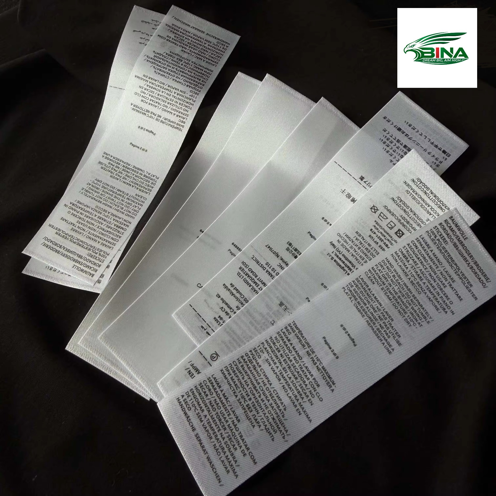 Nhãn satin thường được làm từ các chất liệu mịn, bóng như 100% polyester, nylon, hoặc đôi khi là lụa, mang lại cảm giác mềm mại, sang trọng cho quần áo cao cấp. Những chất liệu bền, chống sờn này thường có các cạnh dệt hỗ trợ in ấn chi tiết, bao gồm in chuyển nhiệt, in kỹ thuật số và in lụa. Satin polyester được ưa chuộng cho nhãn hướng dẫn giặt ủi do khả năng chống giặt và kết cấu mịn.