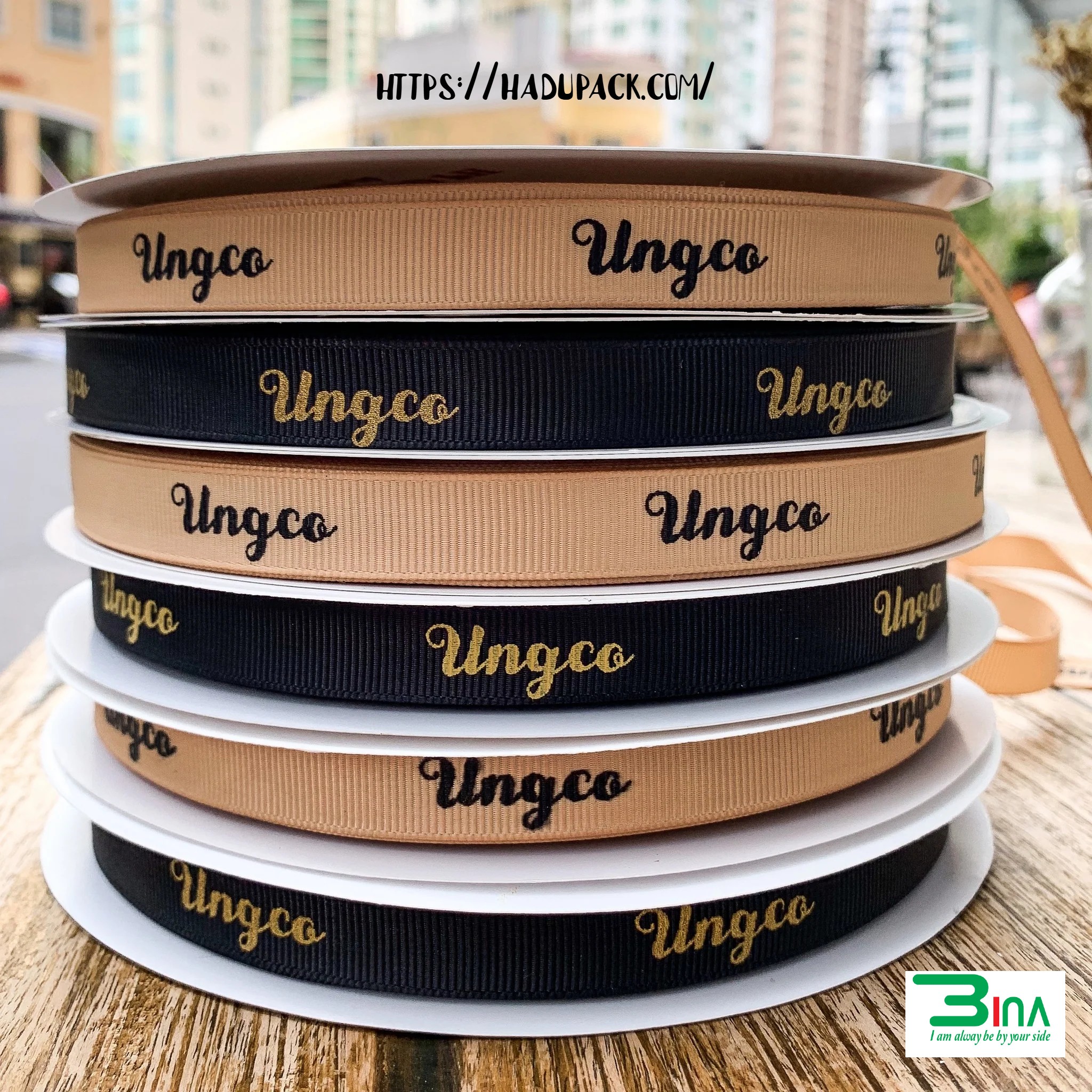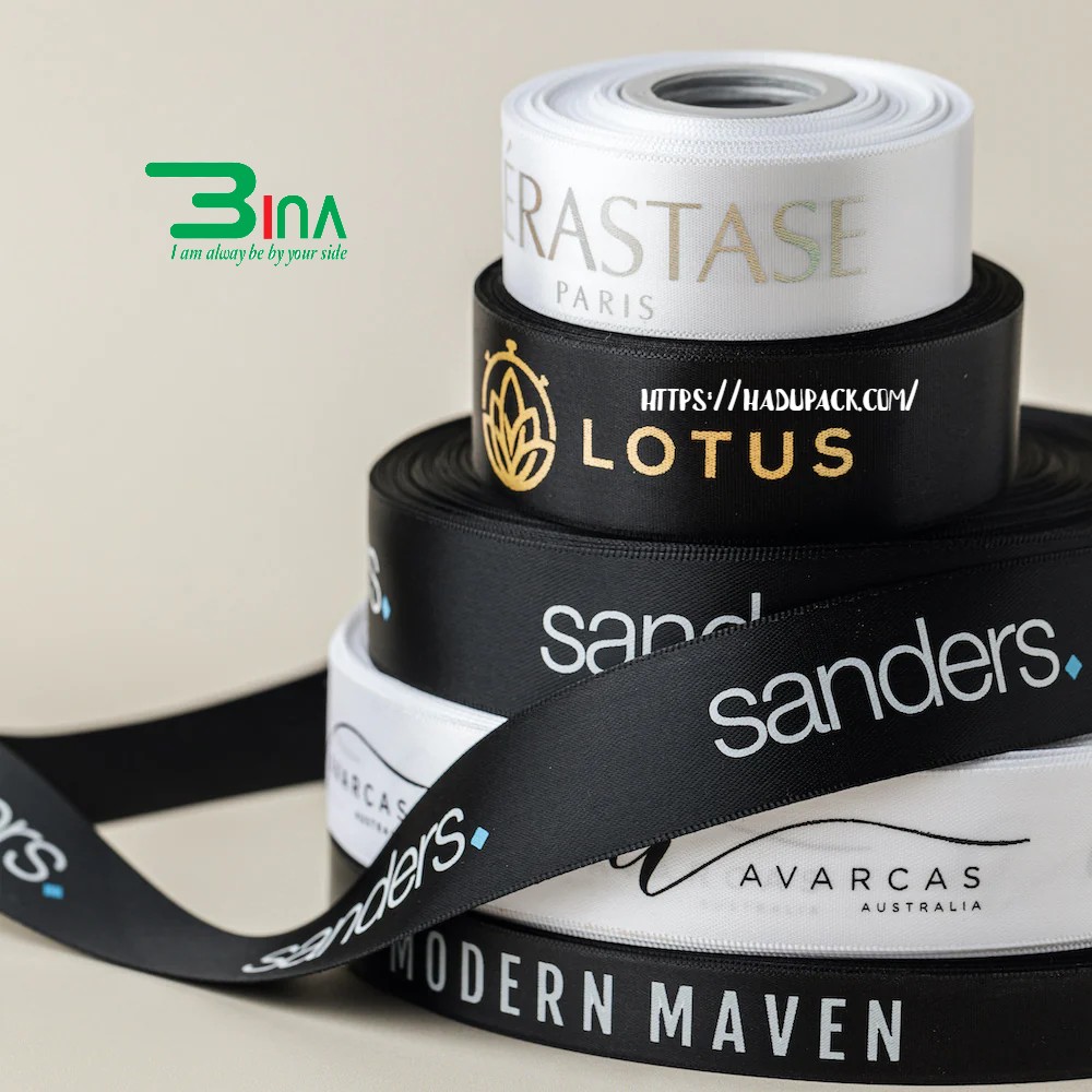 Ruy băng in thêm nét sang trọng cho sản phẩm hoặc bao bì của bạn. Có nhiều độ rộng khác nhau, với logo hoặc thông điệp của bạn dọc theo toàn bộ chiều dài của ruy băng. Ruy băng cá nhân hóa của chúng tôi có sẵn trong hai mươi sáu màu tiêu chuẩn. Ruy băng in satin hoặc grosgrain sẽ là sự bổ sung hoàn hảo cho bao bì in tùy chỉnh của bạn.
