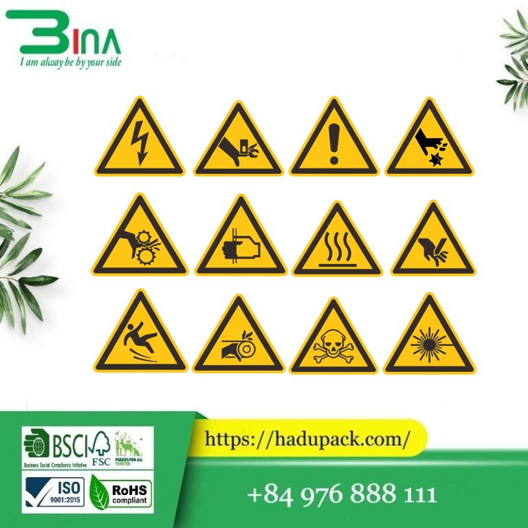 - Thiết kế & Tiêu chuẩn: Nhãn thường kết hợp các màu sắc tiêu chuẩn (ví dụ: màu vàng cho thận trọng, màu đỏ cho nguy hiểm) và các biểu tượng phổ quát để truyền tải thông tin rõ ràng.