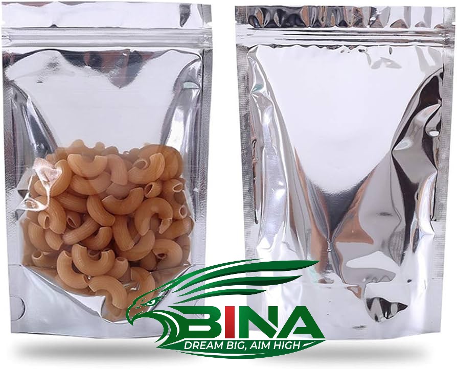 - Túi nhôm sáng: Vật liệu nhôm hóa, bề ngoài có màu trắng bạc, bề mặt sáng.
